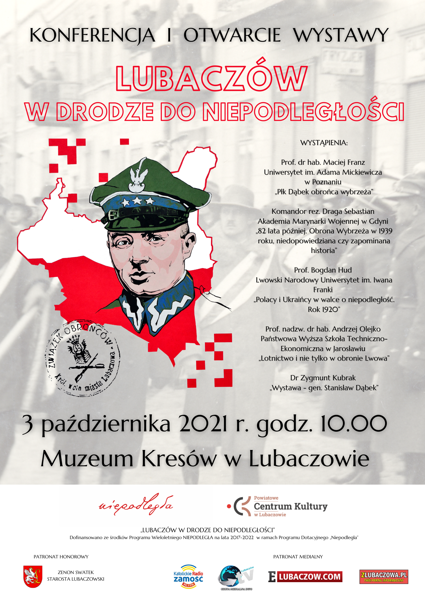 Zapraszamy na konferencję i otwarcie wystawy „Lubaczów w drodze do Niepodległości” poświęconą roli lokalnych bohaterów w procesie odzyskiwania przez Polskę Niepodległości, która odbędzie się 3 października 2021 r. od godz. 1000 w Muzeum Kresów w Lubaczowie.