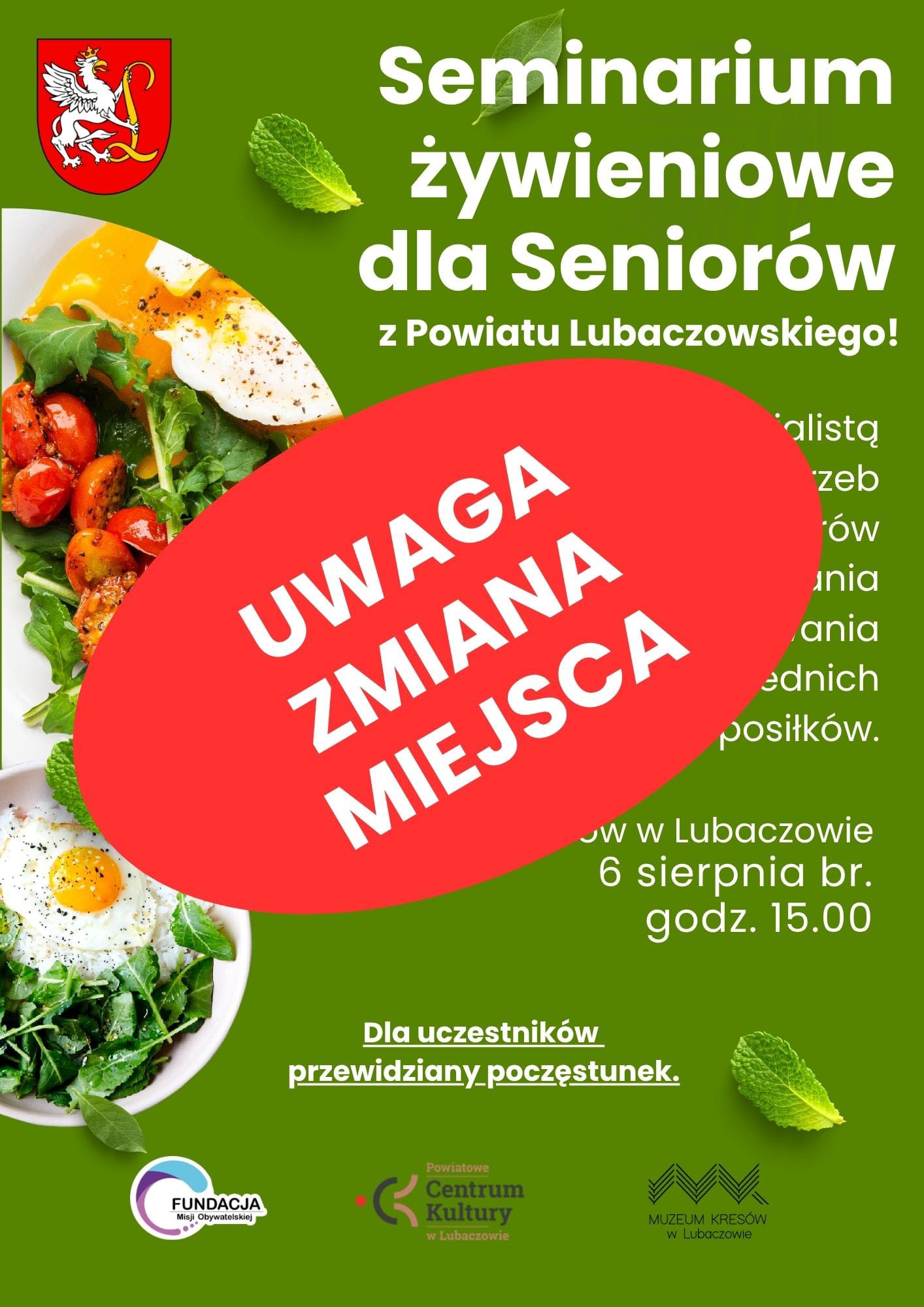 Szanowni Państwo, Drodzy Seniorzy, ze względu na duże zainteresowanie naszym wydarzeniem ZMIENIAMY MIEJSCE